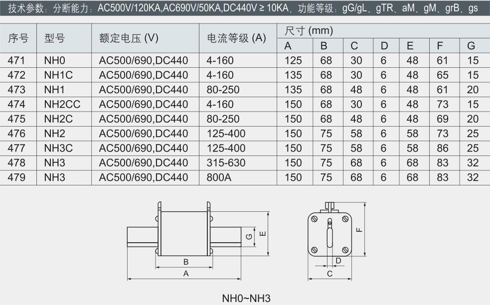 由純銀片制成的變截面熔體封裝于由高強(qiáng)度瓷制成的熔管內(nèi);熔管中充滿經(jīng)化學(xué)處理過(guò)的高純度石英砂作為滅弧介質(zhì);熔體二端采用點(diǎn)焊與觸頭牢固電連接。熔斷體型式有方管刀形觸頭和方管平板形觸頭兩種。熔斷體可帶指示器或撞擊器,當(dāng)熔體熔 斷時(shí),指示器/ 撞擊器立即動(dòng)作,顯示熔斷體已熔斷( 指示器)并推動(dòng)微動(dòng)開(kāi)關(guān)( 撞擊器),發(fā)出各種信號(hào)或自動(dòng)切換電路。 本系列熔斷體適用于交流50Hz、額定電壓至2000V、額定電流至2500A,主要用在電氣線路中作為半導(dǎo)體設(shè)備的短路保護(hù) (aR)。 本系列熔斷體額定分?jǐn)嗄芰χ?00kA。 本系列熔斷體符合國(guó)家標(biāo)準(zhǔn)GB13539.1、GB/T13539.4 和國(guó)際電工委標(biāo)準(zhǔn)IEC60269-1、IEC60269-4。