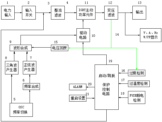 控制系統(tǒng)原理    穩(wěn)頻穩(wěn)壓電源控制系統(tǒng)主要由信號發(fā)生單元,SPWM波生成單元,反饋控制單元,顯示單元,邏輯控制單元,保護單元,六大單元構成。每個單元分別由電路功能模塊組成: 信號發(fā)生單元包含:基準頻率產(chǎn)生電路,正弦波產(chǎn)生電路 SPWM波生成單元包含:三角波產(chǎn)生電路,SPWM波合成電路 反饋控制單元包含:電壓負反饋電路 顯示單元包含:電壓、頻率、電流、功率/功率因數(shù)顯示電路 控制邏輯單元包含:軟啟動電路,故障中斷處理電路,RESET電路 保護單元包含:過載偵測電路,過電壓偵測電路,過熱偵測電路,過流偵測電路,保險絲斷偵測電路 系統(tǒng)功能框圖 穩(wěn)頻穩(wěn)壓電源控制系統(tǒng)按功能順序從輸入到輸出還可分為21項功能單元。
