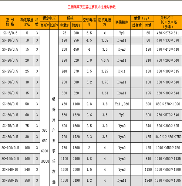 升壓變壓器 SG系列三相升壓變壓器普遍適用于交流50Hz至60Hz,電壓660V以下的電路中,普遍用于重要設(shè)備、精密機床、機械電子設(shè)備、整流裝置,照明等。產(chǎn)品的輸入、輸出電壓的高低、聯(lián)接組別、調(diào)節(jié)抽頭的多少及位置(一般為±5%)、繞組容量的分配、次級單相繞組的配備、整流電路的運用、是否要求帶外殼等,均可根據(jù)用戶的要求進行精心的設(shè)計與制造,但若長期負載使用,總功率不得超過額定容量80%。 產(chǎn)品特點 在升壓隔離變壓器建立新的中線-接地就可解除電網(wǎng)中共模干擾和其它中線的困擾,升壓隔離變壓器將三線△接線轉(zhuǎn)換為四線Yo系統(tǒng),加屏蔽就進一步免除了由變壓器內(nèi)部耦合的高頻脈沖干擾和噪音,雖然有屏蔽的隔離變壓器對各種N-G來的干擾(脈沖和高頻噪聲)能有效防止,但變壓器須正確妥善接地,十分嚴格,否則抗共模干擾將無效果。本公司可以為客戶設(shè)計生產(chǎn)高質(zhì)量的隔離變壓器。 產(chǎn)品特性 Ø高度隔離 Ø N-G性能良好 Ø高度共模干擾抑制 Ø將△轉(zhuǎn)換為Y或Y至△ Ø電壓抽頭容易轉(zhuǎn)換 Ø按用戶的特殊性能要求設(shè)計 技術(shù)指標 輸入額定電壓:三相380V或單相380V或單相220V 工作頻率:50Hz-60Hz 效 率:≥95% 溫 升:<60< p=""> 波形畸變:<0.1%< p=""> 高壓測試:2500V,1分鐘無擊穿 使用條件 適用海拔高度:≤5000m 環(huán)境溫度:-15℃~+45℃ 相對濕度:≤90% 安裝場所應(yīng)無嚴重影響變壓器絕緣強度的氣體,蒸汽,化學性沉積,污垢,導電塵埃及無其他易爆易燃易腐蝕的物質(zhì)。(凡不符合上述使用條件的,應(yīng)與我司協(xié)商確定。 ) SG,DG,OSG,ODG(三相,單相,自耦)YSD干式升壓變壓器是我公司為適應(yīng)各國不同電網(wǎng)制式和有特殊要求的設(shè)備設(shè)計生產(chǎn)的系列產(chǎn)品,具有適用范圍普遍,能承受瞬時的超載,可長期連續(xù)工作的特點。 一、概述: 本產(chǎn)品是我廠針對工礦企業(yè)配套而設(shè)計,適合于電源隔離輸配電等場合。 二、產(chǎn)品用途: 適用于定額頻率為50-60HZ的輸配電之用。 三、結(jié)構(gòu)特征: 本型產(chǎn)品線圈為圓筒式,鐵芯采用迭積式心式鐵芯,高、低壓線頭引至固定的接線極或接線導電排,絕緣等級分為B級、F級、H級。一般用罩殼屏蔽,以策安全。